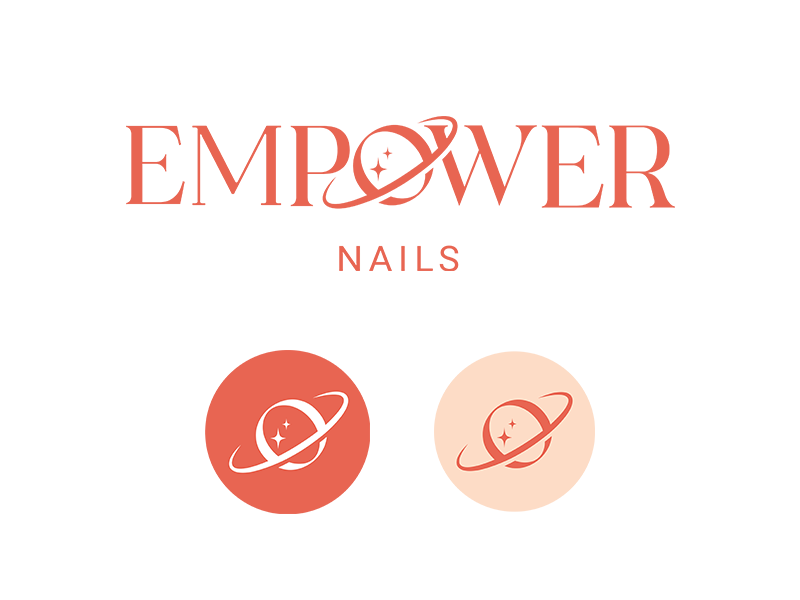 The logo for Empower Nails features a shining planet shape around the letter “O,” symbolizing the empowering energy we want every client to feel after their service. Paired with a bold, empowering orange color palette, it reflects the confidence and beauty that Empower Nails represents.